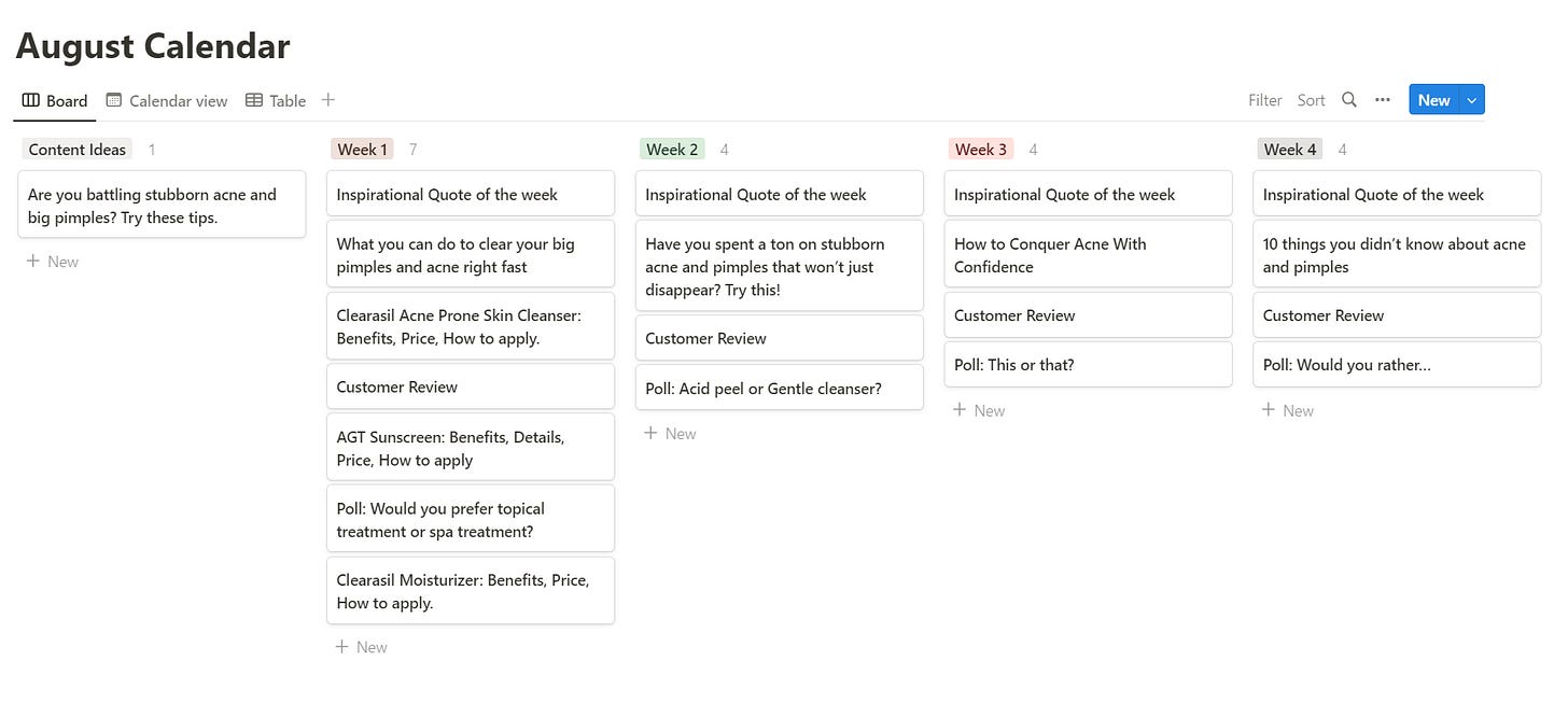 You can use Notion to create a board that helps you capture captivating content ideas, create a schedule and organise your content.